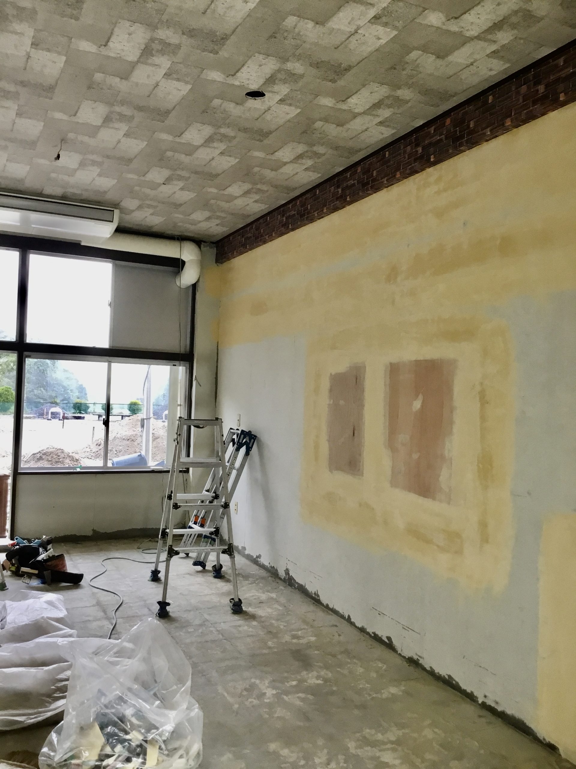 廊下天井の改修も1階がほぼ終わり。仕切りがあると、不思議な感じがしますね。