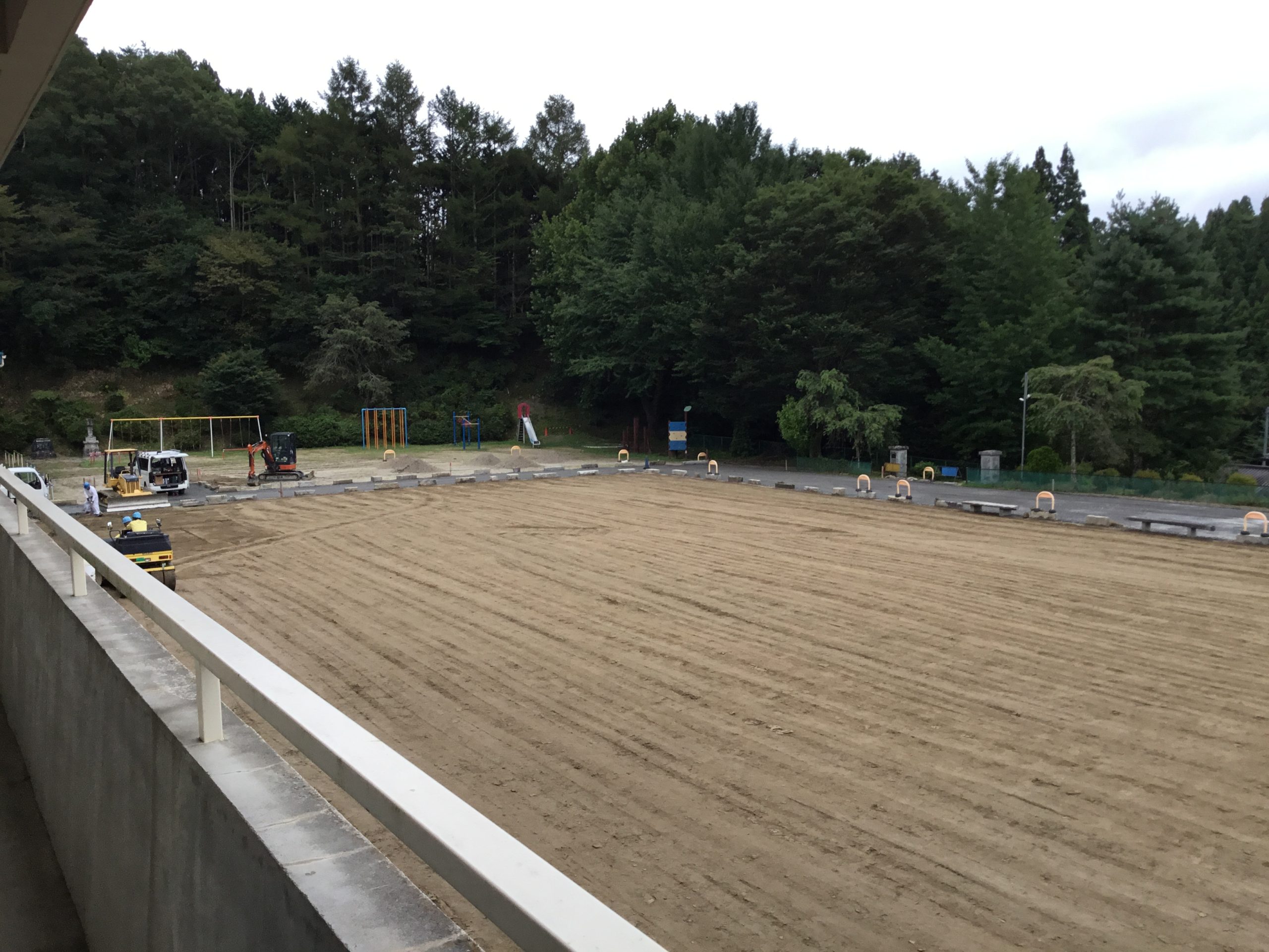 校庭に土を入れて平らにし、駐車場用に砂利を敷き詰めます。もう一度、皆の声が響き渡る遊び場になりますように。