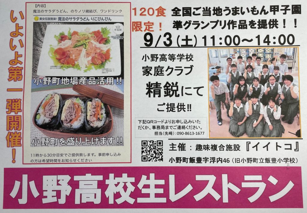 9月3日小野 高校生レストラン11時~14時(一般公開)