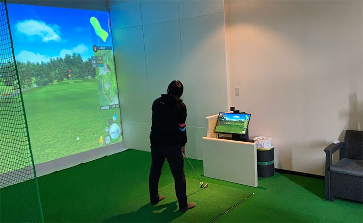ゴルフシミュレータ室の360度画像です。室内でカフェにオーダーして飲食を楽しみながらゴルフが出来ます。また電子ダーツも導入しますので空き時間にどうぞ! -