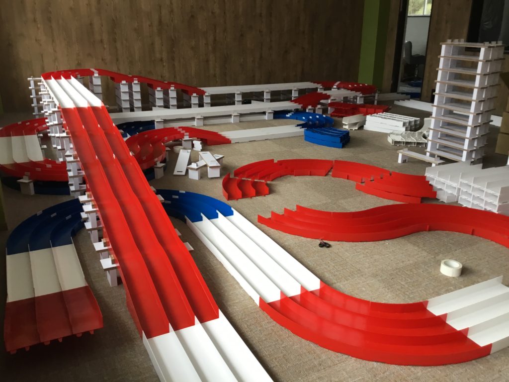 2022年1月6日 2階部分の完成も近づき、本日はミニ四駆のコースを設営しました。 1教室丸々にコースを作りましたが、これは全長300m近くにもなり国内有数の大きなコースとのこと。 マシンを走らせるのが楽しみです。