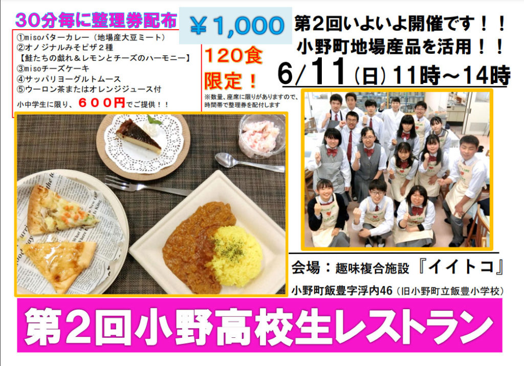 高校生レストラン6月11日(11時~14時)開催致します。 地元小野高校生が、地元食材を使ったお料理を食べにきてくださいね。