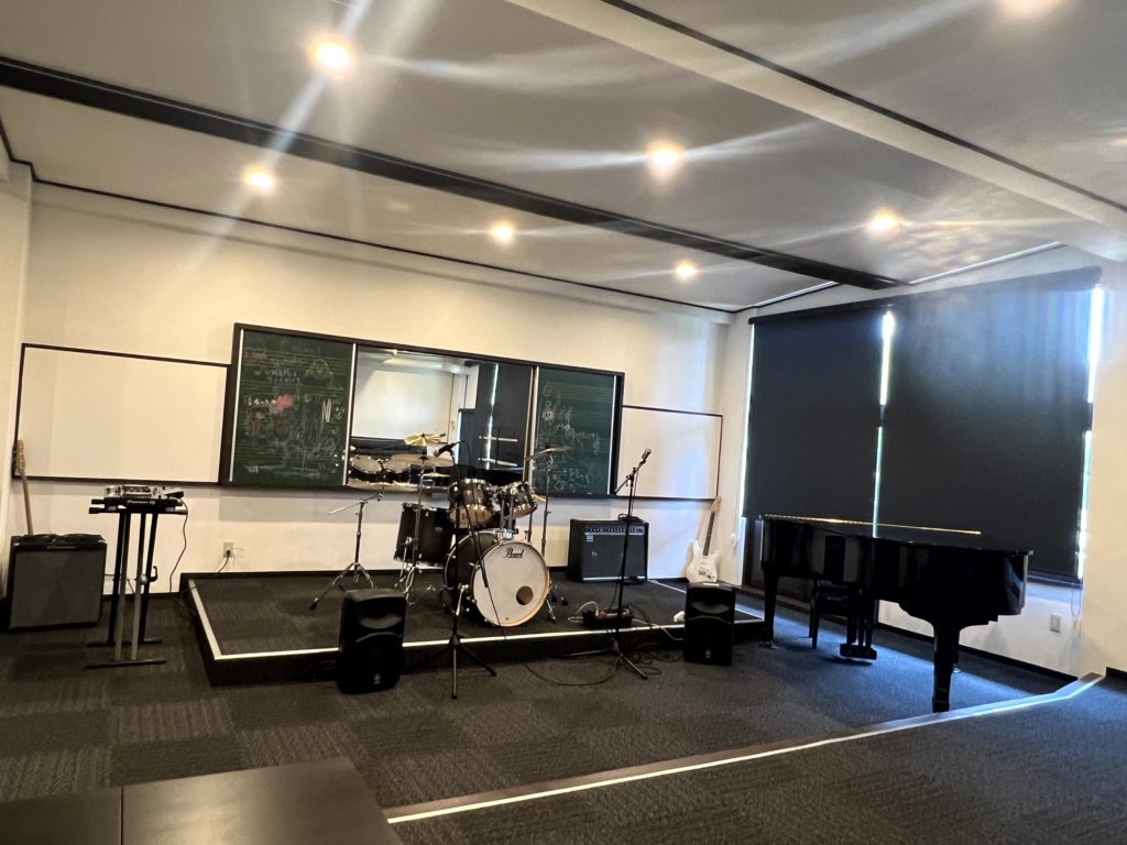 YAMAHAグランドピアノの他、Pearlのドラムセット、Roland・Marshallのギターアンプ、Ampegのベースアンプなどの定番品に、PioneerのDJ機材、YAMAHA STAGEPAS 1K などを揃えています。音楽室にはソファもありますので、ゆっくりと演奏を楽しめます。ミニ演奏会など貸切利用ももちろんOKです。配信機材を使って、その場でバンド活動のライブ配信も出来ます。