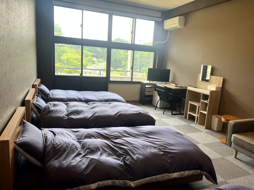校舎を改装したお部屋にお泊りいただけます。新しいビジネスホテルのような設備と空間をお楽しみください。教室を半分に区切り1室60㎡あるため、大変広々と快適に過ごすことができます。