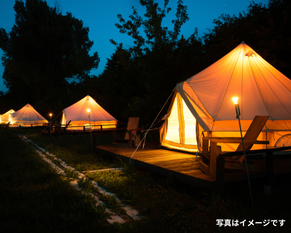 敷地内に設置されたグランピングテントに宿泊。お手軽にリッチなアウトドア体験を楽しむことができます。テントは2棟、それぞれの部屋にBBQハウスとシャワールームが付属します。